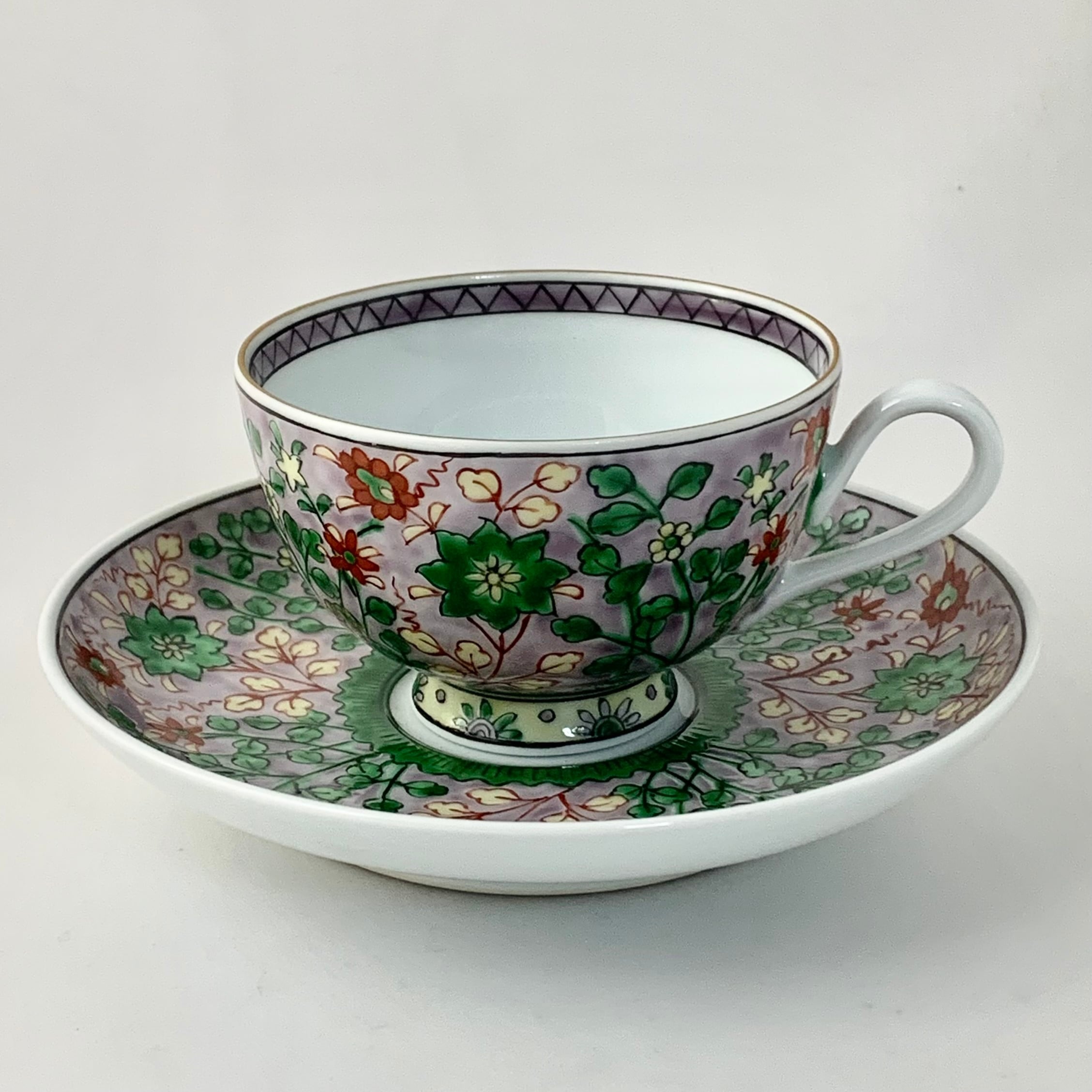 源右衛門窯の赤絵ミナイ手(№2)平碗皿は、まるで花畑を思わせる美しいデザインが特徴です。紫とピンクの中間に描かれた多様な花柄が、見る人の心を奪います。絵柄の豊かさは、料理を引き立て、食卓を華やかに彩ることでしょう。